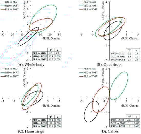 Descriptive data are presented as mean ± standard deviation. After testing each variable for the normality of the distribution (Shapiro–Wilks test), differences in all variables over time (PRE, MID, and POST) were tested using the non-parametric Friedman test and, in the case of differences, the Wilcoxon signed-rank test. The magnitude of changes was computed as delta percent values (∆%). Spearman’s rank coefficient of correlation was applied to determine possible associations between hematological and bioelectrical delta percent changes. An RXc Z-score graph was used to characterize the sample. RXc paired graphs and paired one-sample Hotelling’s T2 test were used to identify bioelectrical changes over time and to check the bioelectrical inter-limb symmetry. The significance level was set at p < 0.05. SPSS (Chicago, IL, USA, ver. 21) and BIVA software [] was used for data analysis.