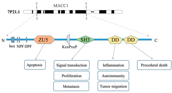 The cDNA encoding MACC1 contains 2559 nucleotide sequences encoding 852 amino acids [12]. The MACC1 protein structure conserved and consists of four domains: ZU5, Src-homolo-gy 3 (SH3), and two C-terminal death domains (DD) (Figure 1). The rather unstructured N-terminus of MACC1 contains similar interaction motifs for clathrin-mediated endocytosis (clathrin box, NPF, DPF) as seen in the MACC1 homolog SH3BP4/TTP. The ZU5 domain, which is at the N-terminus, is made up of two plates sandwiched together into a common sandwich structure. It is primarily concerned with the adhesion of contractile proteins, and ZU5-DD is engaged in controlling the apoptotic process [23]. Proline-rich motifs ((PxPxP, KxxPxP)) and SH3 domains play a part in interactions between proteins [10]. The Src homologous domain’s SH3 domain, which is upstream of the DD domain and strongly binds to the receptor tyrosine kinase’s phosphorylation site to facilitate protein–protein interaction, is implicated in signal transduction, cell proliferation, and metastasis [24]. The biological function of MACC1 depends on the SH3 domain; without the SH3 domain, MACC1 cannot move from the cytosol to the nucleus and its capacity to trigger c-Met transcription is inactivated [12]. There are two death domain family (DD) domains at the MACC1 N-terminus, one of which is strongly associated with the programmed death of cells and plays a role in the development of inflammation, autoimmune modulation, the directional migration of tumor cells, and other functions [25]. The expression of MACC1 in diverse tumor types and its method of involvement in carcinogenesis and development have been the subject of an increasing number of studies in recent years. All tumor types were found to express MACC1, though to variable degrees. MACC1 was mostly expressed in the small intestine and only weakly expressed in the majority of other organs, including the esophagus, mouth, and colon. Additionally, the kidneys and uterus, which are parts of the reproductive and urinary systems, express MACC1 at relatively high levels. Atypical DNA methylation may play a significant role in the variability in MACC1 expression in various tumor types [11]. The unique structural characteristics of MACC1 help us better understand its mechanism of action in cancer.
