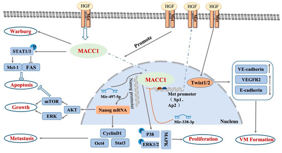 MACC1 effectors, signaling mechanisms, and biological responses. MACC1 is involved in a variety of cancer hallmark functions such as proliferation, metastasis, apoptosis resistance, angiogenesis and Warburg through transcriptional activation of its key target molecules HGF/c-Met, Akt, TWIST1/2, MAPK, Nanog/Oct-4, and STAT.