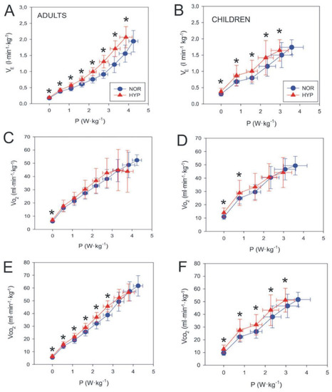 Resting and exercising values of minute ventilation (E; panels (A,B)), oxygen consumption 2; panels (C,D)) and carbon dioxide output (2; panels (E,F)) for both adults and children. Values are reported as means (SD). Significant post hoc differences: * (p < 0.05) denotes significantly different values compared to NOR.