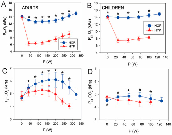Resting and exercising values of end-tidal oxygen pressure (PETO2; panels (A,B)) and end-tidal carbon dioxide pressure (PETCO2; panels (C,D)) for both adults and children. Values are reported as means (SD). Significant post hoc differences: * (p < 0.05) denotes significantly different values compared to NOR.
