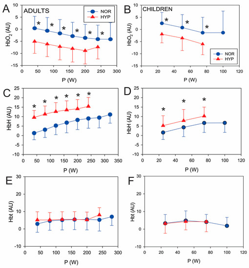 Exercising values of oxygenated haemoglobin (O2Hb; panels (A,B)), deoxygenated haemoglobin (HHb; panels (C,D)) and total haemoglobin (tHb; panels (E,F)) for both adults and children. Values are reported as means (SD). Significant post hoc differences: * (p < 0.05) denotes significantly different values compared to NOR.