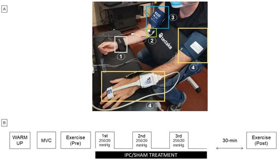 Experimental Setup (A). During the measurements, subjects were sitting on an adapted armchair, specific for the fitness training. The subject rested his forearms on a horizontal support. A load cell (not visible) was connected to the right wrist by a wristband (1). Near infrared spectroscopy probe and EMG electrodes (2) were located on the distal end of the bicep’s brachii muscle, and the pneumatic cuff for ischemic pre-conditioning was located proximally on the right arm (3). Non-invasive blood pressure monitoring was applied to the left arm at the fingers, with a pneumatic cuff around the arm for calibration (4). Schematic representation of the experimental protocol (B). MVC = maximal voluntary contraction; IPC = ischemic preconditioning: 3 × (5 min ON, 5 min OFF, cuff pressure: 250 mmHg); SHAM = sham intervention: 3 × (5 min ON, 5 min OFF, cuff pressure: 20 mmHg). The exercise consisted of unilateral intermittent isometric elbow flexions (3-s ON, 3-s OFF) at 80% MVC until exhaustion.
