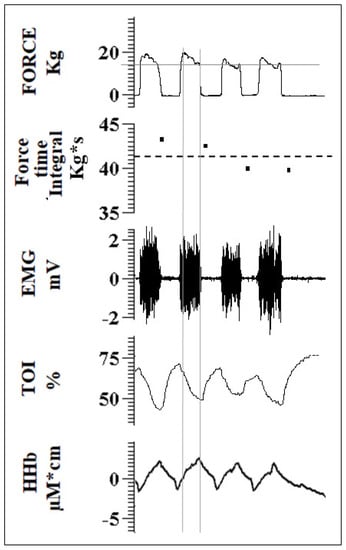 A scheme of the experimental protocol is given in Figure 1B. The subject was familiarized with the set-up, the visual force feedback, and with performing rhythmic isometric elbow flexion according to an acoustic pace (3-s ON; 3-s OFF). To this aim, they were invited to follow a warm-up: 3 sets of 10 repetitions at low force intensity (1st set: 2 kg; 2nd set: 3 kg; 3rd set: 5 kg). They were then asked to perform a Maximum Voluntary Contraction (MVC), which was repeated another two times separated by a 2-min rest. The maximum force level observed, after smoothing the tracing with a 1-s moving average, was taken as the MVC. The fatiguing contraction protocol consisted of a series of unilateral (right) intermittent isometric elbow flexions (3 s ON and 3 s OFF, according to the acoustic cue) at 80% MVC, continued until exhaustion. This contraction level was chosen to reach exhaustion within a reasonable amount of time, while a duration of 3 s appeared to be long enough to reach a stable and controllable force level and stable hemodynamic signals within individual contractions. The force signal was carefully monitored during the exercise: the extent of every single contraction was assessed in terms of magnitude and duration to provide a real detection of fatigue as follows. Visual feedback of the exerted force (low-pass filtered with a 1-s moving average) with an indication of the level (80% MVC) to be reached was provided to the subject. However, to also check for the duration of each contraction (ideally = 3 s), the force–time integral (ideally = 3* 80% MVC kg*s) was simultaneously computed over the whole duration of each contraction bout and visually compared to a threshold level equal to 90% of the expected value, i.e., 0.9* 3* 80% MVC, and expressed in kg*s (see second tracing from top in Figure 2). Failure to maintain this value above the threshold for two consecutive bouts determined the end of the task (exhaustion). This latter condition was monitored by the experimenter and verbally communicated to the subject. To induce IPC (or SHAM), 5 min of inflation and 5 min of deflation of the cuff were repeated three times unilaterally on the right arm. Thus, the IPC (or SHAM) procedure lasted for 25 min. After a 30-min resting time, following the last IPC (or SHAM) cuff inflation, the fatiguing contraction protocol was repeated with identical settings until exhaustion.