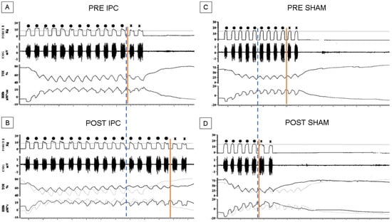 We then investigated hemodynamic and EMG changes during the exercise. Figure 3 shows representative recordings from two subjects belonging to the IPC (Figure 3A,B) and the SHAM group (Figure 3C,D) describing the exercise before (A, C) and after treatment (B, D). As it can be observed, in these subjects, the performance could change substantially pre-and post-treatment along with the time course of NIRS parameters.
