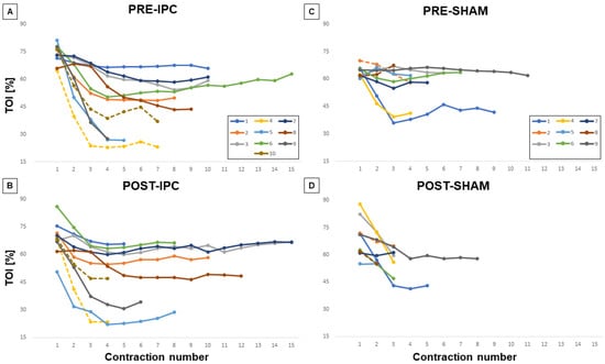 Individual changes in TOI during exercise. Each line corresponds to a different subject and each dot represents an individual contraction during the exercise task for the two groups IPC (A,B) and SHAM (C,D) and the pre- (A,C) and post-treatment conditions (B,D). Dashed lines refer to the individual curves of female subjects.