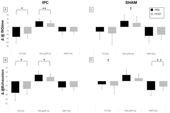 In general, the TOI exhibited an initial decrease, which subsequently stabilized or slightly recovered before the end of the exercise. We observed that the decrease in TOI was significantly reduced post-IPC vs pre-IPC, both at ISOtime (17.6 ± 12.2% vs. 25.4 ± 15.4%, p < 0.05, 5A) and at exhaustion (16.9 ± 12.5% vs. 25.6 ± 17.4%, p < 0.05, Figure 5B). Conversely, no effect of treatment was observed in the SHAM group (Figure 5C,D), with a significant difference between the IPC and SHAM groups at exhaustion (p < 0.05). Similar effects were observed on HHb, which generally increased during exercise. The HHb increase was smaller post-IPC compared to pre-IPC, both at ISO-time (p < 0.01, Figure 5A) and at exhaustion (p < 0.05, Figure 5B), while no significant change was observed in the SHAM group (Figure 5C,D), with a significant between-group difference at ISOtime.