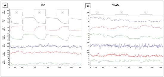 Hemodynamic responses to 1st (1), 2nd (2), and 3rd (3) compressive stimuli in IPC (A) and SHAM (B) in two representative subjects. From top to bottom: Cuff Pressure (P); tissue oxygenation index (TOI); changes in deoxy-hemoglobin (HHb = deoxHb + deoxyMb), oxy-hemoglobin concentration (O2Hb = oxyHb + oxyMb), heart rate (HR); arterial blood pressure (MAP) and cardiac output (CO).