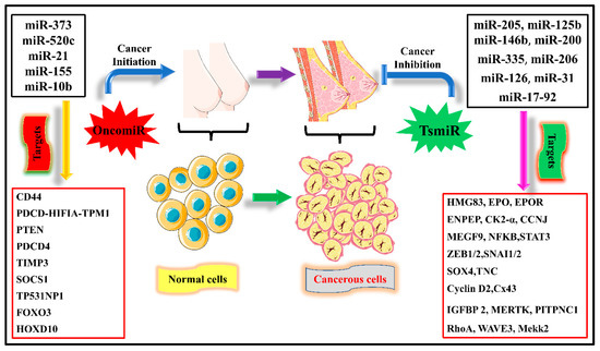 An overview of various miRNAs responsible for initiating cell proliferation and invasion in breast cancer, which are called oncogenic miRNAs (oncomiRs). While miRNAs responsible for tumor suppression are tumor suppressor miRNAs (TS miR), whose main function is the inhibition of migration, invasion, proliferation, and apoptosis. Different miRNAs have different targets for their activity in suppressing tumor growth.