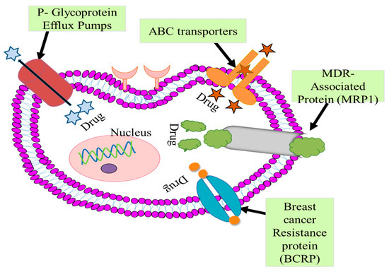 ABC transporters (ATP-binding cassette) transporters are trans-membrane transporter proteins discovered in drug-resistant cancer cells [50]. The primary ABC transporters linked to the development of multidrug resistance in mammary cancer types are many drug resistance-related BC resistance proteins (BCRP), P-glycoprotein (PGP), and protein-1 (MRP1) [51,52].
