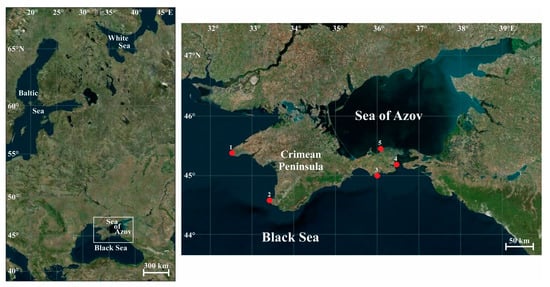 Map of the study area and sampling locations, 2009–2016. 1—Cape Tarkhankut (45.33° N, 32.47° E); 2—Sevastopol (44.60° N, 33.43° E); 3—Karadag Nature Reserve (45.13° N, 35.19° E); 4—Kerch Strait (45.13° N, 34.42° E); 5—Cape Kazantip (45.47° N, 35.83° E).