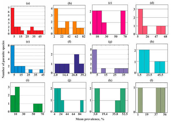 Frequency distribution of parasite prevalence in common fish species from Crimea. (a)—Chelon auratus; (b)—Mugil cephalus; (c)—Planiliza haematocheilus; (d)—Chelon saliens; (e)—Atherina boyeri; (f)—Atherina hepsetus; (g)—Belone belone; (h)—Diplodus annularis; (i)—Trachurus mediterraneus; (j)—Spicara smaris; (k)—Alosa immaculata; (l)—Engraulis encrasicolus.