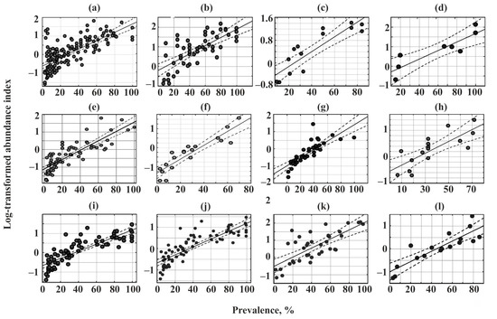 Relationships between the prevalence and log-transformed abundance indices of parasites in common fish species from Crimea. (a)—Chelon auratus; (b)—Mugil cephalus; (c)—Planiliza haematocheilus; (d)—Chelon saliens; (e)—Atherina boyeri; (f)—Atherina hepsetus; (g)—Belone belone; (h)—Diplodus annularis; (i)—Trachurus mediterraneus; (j)—Spicara smaris; (k)—Alosa immaculata; (l)—Engraulis encrasicolus.