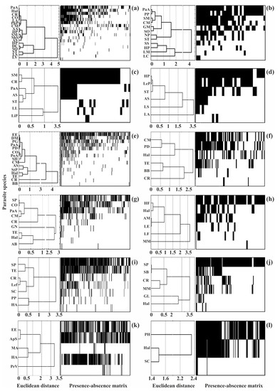 Clustering of helminth species by infection indices and presence–absence matrices for infracommunities of common fish species from Crimea. (a)—Chelon auratus; (b)—Mugil cephalus; (c)—Planiliza haematocheilus; (d)—Chelon saliens; (e)—Atherina boyeri; (f)—Atherina hepsetus; (g)—Belone belone; (h)—Diplodus annularis; (i)—Trachurus mediterraneus; (j)—Spicara smaris; (k)—Alosa immaculata; (l)—Engraulis encrasicolus. See Table 2 for the parasite species codes.