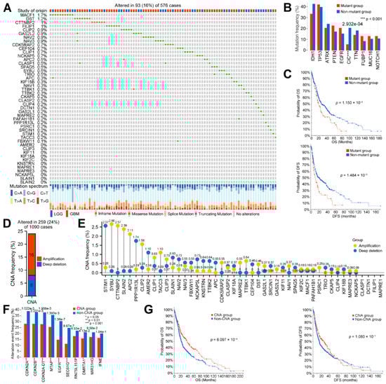 To study the correlation and function of these genes in glioma, we systematically analyzed them from the aspects of genetic alteration, DNA methylation, mRNA expression, mRNA correlation, protein–protein interaction, and functional correlation. Firstly, we visualized the genetic alteration of the MPERGs, including the single nucleotide alteration (SNA) and can, from cBioPortal. Only 16% (93/576) of patients had MPERG mutations, and the mutation frequency of individual genes was very low (≤1.7%). The mutation styles mainly included in-frame, missense, splice, and truncating mutations (Figure 2A). To further observe the mutations of other genes, we divided the sample into the MPERG mutant group and the non-mutant group. As shown in the histogram, IDH1, TP53, ATRX, PTEN, EGFR, CIC, TTN, FUBP1, MUC16, and NOTCH were the ten genes with the highest mutation frequency in any group (Figure 2B; Table S1). Among them, TP53, ATRX, PTEN, EGFR, and NOTCH1 are the 50 most commonly mutated genes in cancer, while IDH1 mutation is a mark event for the early development of glioma, indicating a favorable prognosis [,]. However, only the frequency of the CIC mutation had a significant difference between the two groups (p = 2.932 × 10−4). In addition, the overall survival (OS, p = 1.150 × 10−2) and disease-free survival (DFS, 1.484 × 10−3) in the mutant group were shorter than those in the non-mutant group (Figure 2C). Next, we examined the CNA of the MPERGs. Here, 24% (259/1090) of the patients had MPERG CNAs, and amplification (16%) was more likely to occur than deep deletion (8%) (Figure 2D). Similarly, the CNA frequency of each gene was very low (<3%) (Figure 2E; Table S2). Among these patients, CDKN2A, CDKN2B, CDKN2A-DT, MTAP, EGFR, SEC61G, RN7SL151P, DMRTA1, M1R31HG, and IFNE were the ten genes with the highest CNA frequencies, and the frequencies of CDKN2A, CDKN2B, CDKN2A-DT, MTAP, EGFR, SEC61G, and DMRTA1 were lower in the MPERG CNA group than in the non-CNA group (Figure 2F). Additionally, compared with the non-CNA group, the MPERG CNA group had higher OS (p = 6.097 × 10−4), while no significant variation in the DFS was detected (Figure 2G). According to our findings, although the genetic alteration of individual MPERGs is very low, the overall alteration of the MPERGs still causes dysfunction, leading to significant prognostic differences in glioma patients.
