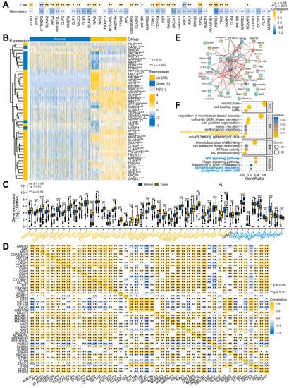Previous studies have demonstrated that CNA and DNA methylation are crucial factors in regulating gene expression [,]. Our correlation results also showed that most MPERGs positively correlated with the CNAs, while they negatively correlated with DNA methylation (Figure 3A; Table S3). Therefore, we further evaluated the MPERG expression between the normal and glioma tissues with TCGA and GTEx data from the UCSC Xena database. Based on the Wilcoxon rank-sum test, 45 differentially expressed MPERGs (DEMPERGs) were found, including 36 upregulated and 9 downregulated genes (Figure 3B,C). Most MPERGs had correlation with each other in glioma (Figure 3D; Table S4). Additionally, the PPI analysis identified MAPRE1, CKAP5, MAPRE3, CLIP1, KIF11, and KIF2C as hub proteins of interaction (node degree ≥ 10) (Figure 3E; Table S5).