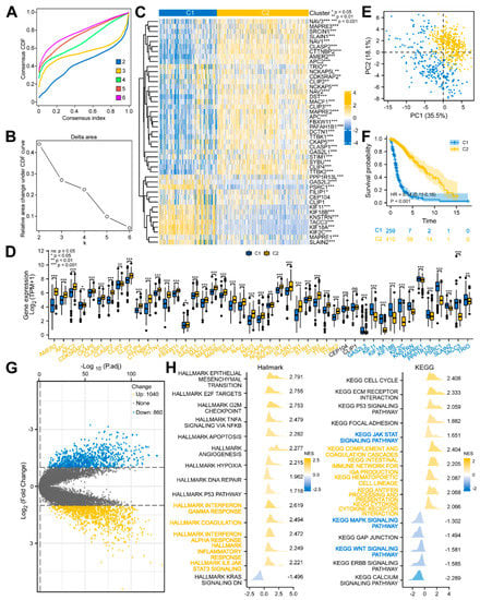 First of all, the MPERGs were directly used for the Gene Ontology (GO) and Kyoto Encyclopedia of Genes and Genomes (KEGG) functional studies with the clusterProfiler R package (v 3.14.3). The cluster-associated genes were identified with the limma R package (v 3.40.2) and visualized using a volcano plot []. Then, the cluster-associated genes were further used for a Gene Set Enrichment Analysis (GSEA) containing the h.all.v7.2 (Hallmark) and c2.cp.v7.2 (KEGG) gene sets with the clusterProfiler R package [,].