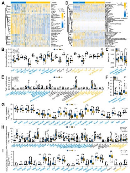 Cluster−associated glioma patients were infiltrated in different TMEs. (A–F) Complex heatmaps and histograms of the TME infiltration between the two clusters using the ssGSEA and ESTIMATE (A–C) and xCell (D–F) algorithms. (G–I) Histograms of the MHC (G), immunostimulator (H), and immunoinhibitor (I) expression between the two clusters. MHC, major histocompatibility complex.