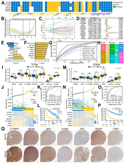Development and validation of an MPERG−associated prognostic signature in glioma using the TCGA and CGGA datasets. (A) Univariate Cox and KM analyses of the DEMPERGs. (B) LASSO Cox regression analysis of the prognostic−related DEMPERGs using a ten−fold cross−validation method. (C) The solution path plot of the variable against the L1 norm. (D) Forest plot of the multivariate Cox regression analysis of the screened genes with OS. * p < 0.05, ** p < 0.01. (E) Bar charts of the variables and their coefficients. (F) C-indexes of the regression model. (G) ROC analysis of the survival status for the risk signature and associated gene. (H) Sankey plot of the correlation among the clusters, risk scores, and survival statuses. (I,M) Signature gene expression between the two risk groups. (J,N) Risk score plot. (K,O) Time−dependent ROC curve. (L,P) KM OS plot of the two groups. (Q) Signature protein expression between the normal and glioma samples.