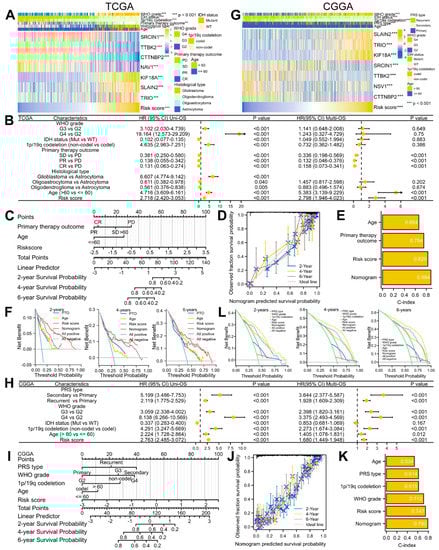 Building and verification of a predictive nomogram model in glioma using the TCGA and CGGA datasets. (A,G) Complex heatmaps of the risk signature and clinical features. ** p < 0.01, *** p < 0.001. (B,H) Forest plots of the uni− and multi−variate Cox regression analyses. (C,I) Nomogram model of the independent prognostic factors. (D,J) Calibration analyses of the OS nomogram. (E,K) C-index plots of the OS nomogram. (F,L) DCA plots of the OS nomogram.