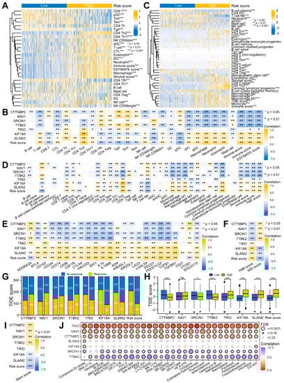 Application of the risk signature to immunotherapy and chemotherapy. (A,C) Complex heatmaps of the TME infiltration in the two risk groups using the ssGSEA, ESTIMATE (A), and xCell (C) algorithms. (B,D–F) Heatmaps of the correlation between the risk signature and TME infiltration (B,D), immunoinhibitors (E), TMB and MSI scores (F). (G,H) Histograms of the ICB response (G) and TIDE score (H) prediction using the TIDE algorithm. ns p ≥ 0.05, * p < 0.05, ** p < 0.01, *** p < 0.001. (I) Heatmap of the correlation between the risk signature and stem score. (J) Heatmap of the correlation between the signature gene and IC50 of drug from the GSCA portal.