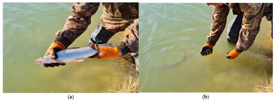 Collecting Aral barbel in the retaining zone of the Aral (Small) Sea: (a) one of the individuals caught in Small Aral Sea, 2021; (b) release of the barbel after biological measurements.