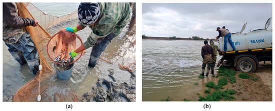 The data obtained make it possible to recommend the capture of barbels from the Aral–Syrdarya basin and irrigation systems of rice farms to start work on the formation of artificial schools of these species and the development of biotechnology for their artificial breeding. Such work has already been carried out in past years [] and has yielded encouraging results.