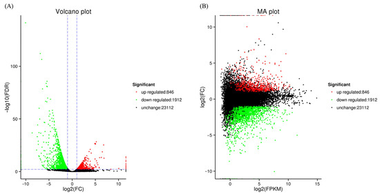 A volcano plot was constructed (Figure 2A) as well as an M-versus-A (MA) plot (Figure 2B) to illustrate the general trend of gene expression levels and comparative multiples among samples. A total of 2758 DEGs were identified, with 846 up-regulated and 1912 down-regulated in the treatment group.