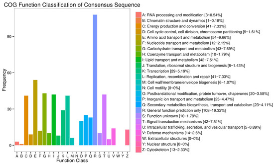 According to the COG function classification of the unigenes, the most enriched group was “general function prediction only” (19.32%), followed by “amino acid transport and metabolism” (9.66%), “carbohydrate transport and metabolism” (7.69%), “signal transduction mechanisms” (7.51%), “replication, recombination, and repair” (7.33%), “energy production and conversion” (7.33%), “lipid transport and metabolism” (7.51%), “transcription” (5.19%), and “inorganic ion transport and metabolism” (4.47%) (Figure 4).