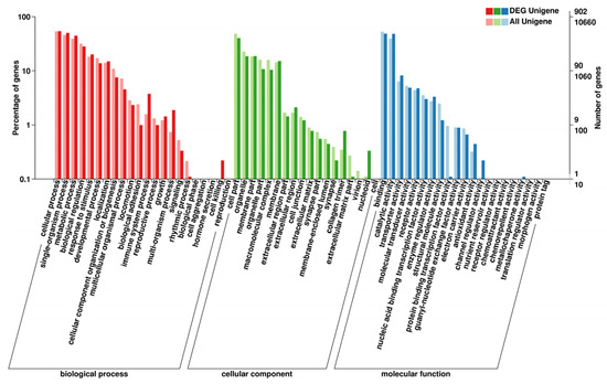 Gene ontology (GO) categorization of DEGs in the treatment and control groups of unigenes.