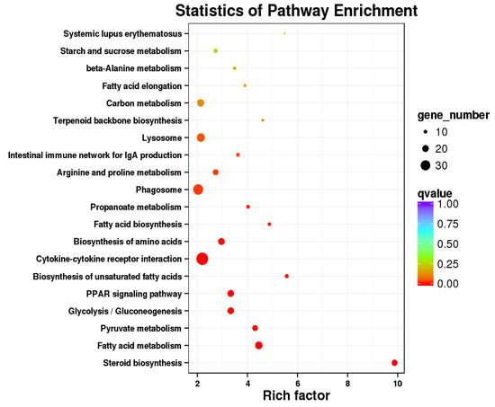 Subsequently, pathway enrichment analysis was performed, and the top 20 significantly enriched pathways were identified, including steroid biosynthesis, fatty acid metabolism, pyruvate metabolism, propanoate metabolism, cytokine-cytokine receptor interaction, biosynthesis of amino acids, fatty acid biosynthesis, glycolysis/gluconeogenesis, biosynthesis of unsaturated fatty acids, PPAR signaling pathway, and other pathways (Figure 6).