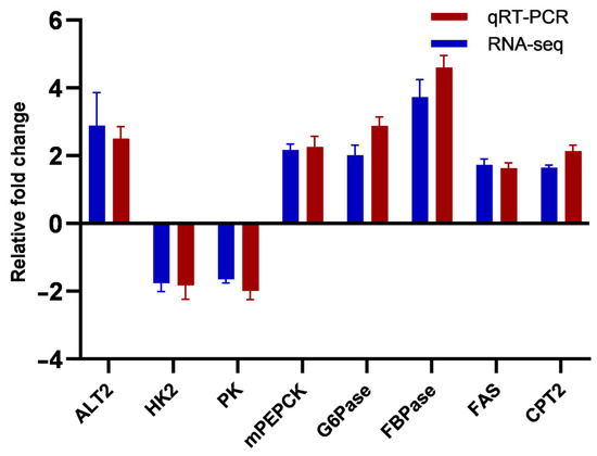 The current research verified the DEGs, which were identified with the aid of RNA-Seq, using qRT-PCR of eight crucial metabolic enzymes (Figure 7). The results of the RNA-Seq and qRT-PCR assays for the eight DEGs revealed an up-regulation pattern of alanine aminotransferase 2 (ALT2), phosphoenolpyruvate carboxykinase mitochondrial isoform (mPEPCK), glucose 6-phosphatase (G6Pase), fructose 1,6-bisphosphatase (FBPase), fatty acid synthase (FAS), and carnitine palmitoyltransferase 2 (CPT2), and a down-regulation pattern of hexokinase (HK2) and pyruvate kinase (PK).