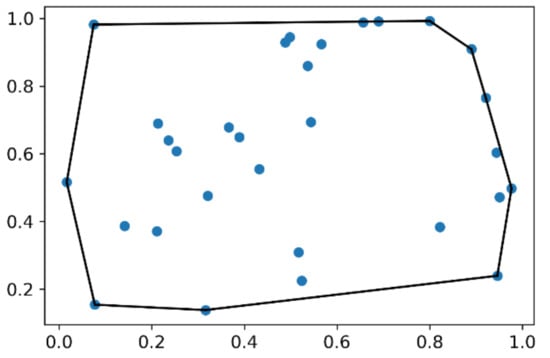 Generally, the convex hull of a set of points is the smallest possible convex polygon (in 2D) or polyhedron (in 3D) that bounds all of the points of a track [20]. Using this notion, various metrics can be extracted from the shape of the convex hull, including the volume and surface area. Below is an image (Figure 2) illustrating the convex hull in 2D, where the set of points joined by the black line forms the convex hull.