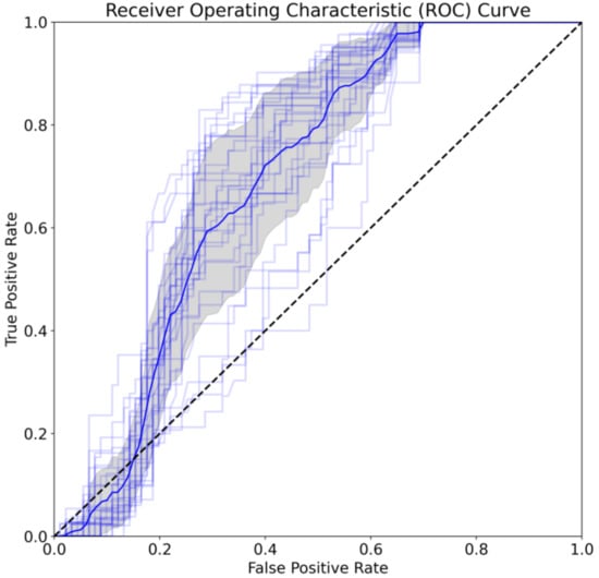 ROC curve for predictions of the tracks displaying the performance at various classification thresholds. All folds are included in light blue with the average indicated in the dark blue and the standard deviation in the grey shadow.