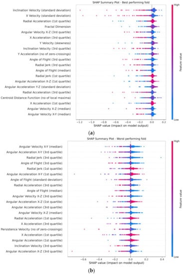 SHAP summary plot displaying the contributions of each feature to the model. The features are ordered by absolute feature contribution and the top twenty are displayed. A full list can be found in Figures S9 and S10. Each dot represents a segment, with its colour displaying its feature value. Positive SHAP values contribute towards the male class, while negative values contribute to the non-male class. (a) Summary plot of the best-performing fold. (b) Summary plot of the worst-performing fold.