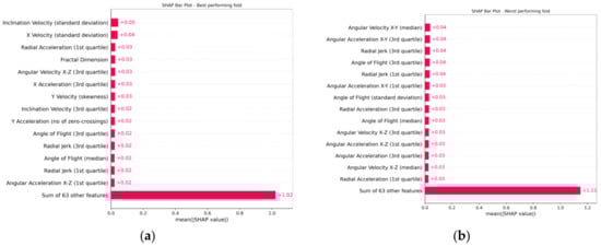 SHAP bar plot of the contributions of each feature to the model. The features are ordered by absolute feature contribution and the top fifteen are displayed. A full list can be found in Figures S11 and S12. (a) Bar plot of the best-performing fold. (b) Bar plot of the worst-performing fold.