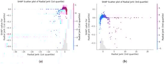 SHAP scatter plot of the (a) 1st and (b) 3rd quartiles of radial jerk displaying the distribution of contributions of each feature value.