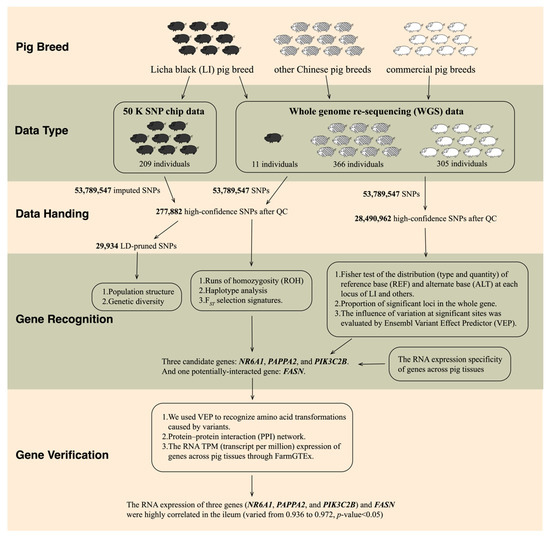 We processed the downloaded WGS data of 451 individuals with GATK v4.1.6 [11] and obtained 53,789,547 SNPs, the same as the newly generated WGS data. We consolidated all the WGS data and performed basic filtering using PLINK v1.9 [12] (command: PLINK --geno 0.1 --mind 0.1 --maf 0.05), which retained 28,490,962 SNPs from the WGS data of 11 LI pigs, 366 Chinese pigs, and 305 commercial pigs. We used the filtered WGS data for “screening of candidate genes using whole genome sequencing data (in Section 2.6)” (Figure 1).