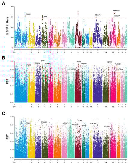 Manhattan plot collection. (A) Frequency of occurrences of each SNP within ROH regions in Licha black pig. The x-axis represents the locations of SNPs, and the y-axis represents the percentage of SNPs occurring within ROH regions. (B) The distribution of selection signatures between Licha black pigs and the other Chinese pigs was detected by FST. The x-axis represents the locations of SNPs, and the y-axis represents the FST values. (C) The distribution of selection signatures between Licha black pigs and commercial pigs was detected by FST. The red line represents the top 1% threshold for statistical significance. Genes related to growth, muscle, and fat have been identified.