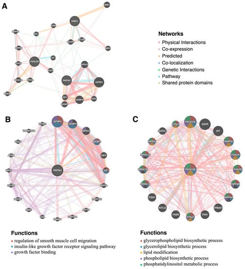 The PPI (protein–protein interaction) networks of NR6A1, PAPPA2, and PIK3C2B and its interacting protein partners. (A) The PPI networks of NR6A1, PAPPA2, and PIK3C2B. (B) The PPI networks of PAPPA2 and its interacting protein partners and functions. (C) The PPI networks of PIK3C2B and its interacting protein partners and functions.