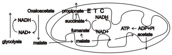 Pyruvate may be reduced to lactate to reoxidize cytosolic NADH and allow for glycolysis (which must reduce NAD+) to continue. Apart from some vertebrates, very few metazoans primarily use this pathway to maintain redox balance in the absence of molecular oxygen [10,11,12]. More typically, under long-term anaerobic conditions, cytosolic NADH is reoxidized by, for example, forming malate from oxaloacetate. Malate could then be processed in mitochondria, with the additional NADH reoxidized using a truncated electron transport chain running the Krebs cycle backwards and forming succinate, which may then be converted into products such as acetate and propionate before excretion. As with other eukaryotes, metazoans do not to operate the entire Krebs cycle in reverse, although many prokaryotes do [13].