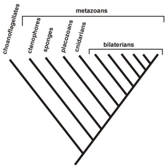 The five early-diverging groups of metazoans: ctenophores, sponges, placozoans, cnidarians, and bilaterians. The order of divergence is subject to considerable debate [32]. Choanoflagellates represent the sister group to Metazoa.