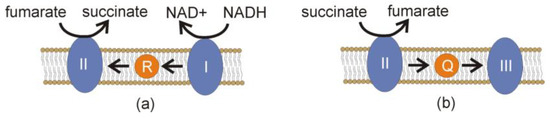 The use of ubiquinone and rhodoquinone in electron transport. (a) As part of the reductive branch of malate dismutation under anaerobic conditions, NADH is oxidized to NAD+ by complex I (I) of the electron transport chain. Electrons are carried by rhodoquinone (R) to fumarate reductase (II), reducing fumarate into succinate. (b) In the presence of oxygen, Complex II participates in the canonical electron transport chain, oxidizing succinate into fumarate and donating electrons to ubiquinone (Q), which carries the electrons to Complex III.