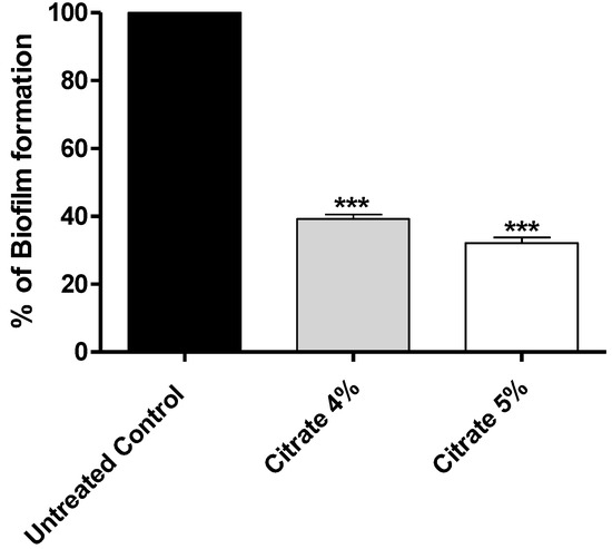 Sodium citrate at 4% or 5% significantly diminished the biofilm formation with percentages exceeding 60% when compared with the untreated control. The data are presented as percentage change from the untreated control (Figure 2).