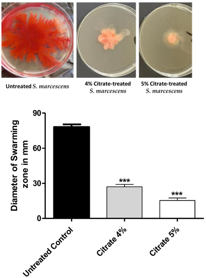 The effect of sodium citrate at 4% and 5% on bacterial swarming motility was performed as described previously [72,73]. Briefly, 5 µL of optically adjusted bacterial suspensions were centrally spotted on the surface of Mueller–Hinton (MH) agar with or without 4% or 5% sodium citrate. After overnight incubation, the swarming zones were measured. The diameters of Serratia treated with sodium citrate were measured in mm and calculated as percentage change from untreated Serratia control using formula: [(Untreated control swarming zone − Citrate treated swarming zone)/Untreated control swarming zone] × 100.