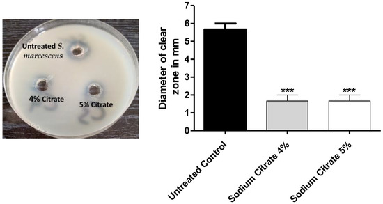 Skim milk method was used to evaluate the effect of sodium citrate (4% or 5%) on the protease activity [40,58]. The supernatants were collected by centrifugation of LB cultures of optically adjusted bacterial growth in the presence or absence of sodium citrate 4% or 5%. Skim milk LB agar plates were prepared by adding 5% skim milk, not containing any proteases. The preformed wells in the skim milk agar were filled with supernatants containing protease. The diameters of the clear zones that indicate proteolytic activities were measured after overnight incubation. Sterilized LB was poured into wells as negative control, while untreated Serratia protease was considered as positive control [15,21,23,70]. The clear zone formed around the sodium citrate treated Serratia were calculated as percent change from clear zones formed around wells contain untreated Serratia control.
