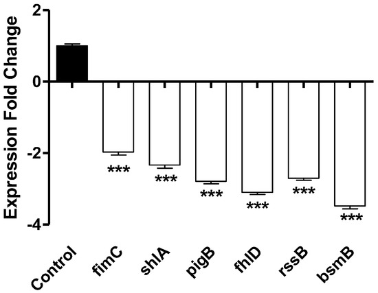 Bacterial virulence factors, in particular biofilm formation, are an additional burden that enhance the resistance of and complicate bacterial infections [95,96,97,98]. The contamination of food processing equipment, storage containers, and of food itself mean biofilms can lead to economic loss, and it can infect consumers leading to clinical symptoms and illness [96,99]. Sodium citrate significantly diminished biofilm formation by S. marcescens. The biofilm formation is a multistep process starting with the adhesion mediated by different types of pili [29,96,100,101]. Importantly, S. marcescens depends on type I pili encoded by the operon fimABCD to initiate biofilm formation [102]. The transcriptional factors BsmA/B enhance the production of S. marcescens type I pilus [36]. In agreement with phenotypic findings in which sodium citrate decreased the biofilm formation, sodium citrate at 5% significantly decreased the expression of the fimbrial protein-encoding gene fimC and type I fimbriae regulatory protein bsmB gene (Figure 6, Table 1).