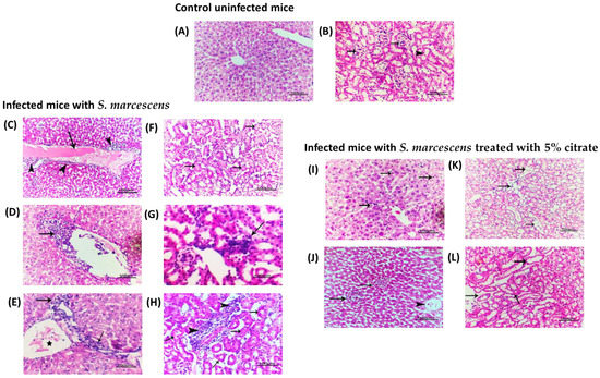 To determine the effect of sodium citrate (5%) on abrogating the S. marcescens-induced pathogenesis in the liver and kidney tissues of infected mice; demonstrative photomicrographs were captured from the infected mice with sodium citrate-treated or -untreated S. marcescens (Figure 7). The kidney or liver of mice from the uninfected group or sterile PBS-injected group showed normal tissue architecture and cellular details (Figure 7A,B). The liver tissues from the mice group injected with untreated S. marcescens showed severe congestion of hepatic blood vessels with perivascular inflammatory cells infiltration (Figure 7C–E). Similarly, the renal tissues from the mice group injected with untreated S. marcescens showed atrophy and degeneration of some renal tubules with focal areas of leucocytic cells infiltration (Figure 7F–H). On the other hand, the tissues isolated from the mice group injected with sodium citrate-treated S. marcescens showed only mild congestion of hepatic blood vessels (Figure 7I,J) and minimal focal areas of cystic dilation of some renal tubules (Figure 7K,L). The present findings reveal the marked in vivo diminishing effect of citrate on S. marcescens pathogenesis.