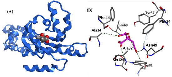 (A) 3D Citrate (Filled space shape)—S. marcescens SmaR model (blue ribbon). (B) 3D citrate—S. marcescens SmaR interactions, citrate is thick purple sticks, amino acid residues are grey sticks, and H-bonds are shown as dark green dots.
