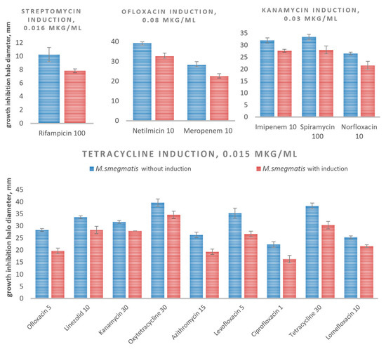 The overnight culture of M. smegmatis was diluted in fresh Lemco-Tw medium, supplemented with an antibiotic in the maximum non-inhibiting concentration, with an initial OD600 = 0.05 in 10 mL. The cultures were incubated at 200 rpm and 37 °C overnight until OD600 = 1.2. Afterwards, drug susceptibility was assessed by paper-disc assay: the culture of M. smegmatis was diluted 1:9:10 (culture:water:M290 medium) and seeded over the base agar layer on Petri dishes. The culture medium was supplemented with the same amount of antibiotic used for induction in liquid medium. The HiMedia Laboratories Pvt. Ltd. (Maharashtra, India)—discs (Kirby–Bauer Disk Diffusion Susceptibility Test Protocol) were used for most antibiotics (netilmicin 10 μg/disc, meropenem 10 μg/disc, imipenem 10 μg/disc, spiramycin 100 μg/disc, norfloxacin 10 μg/disc, ofloxacin 5 μg/disc, linezolid 10 μg/disc, kanamycin 30 μg/disc, oxytetracycline 30 μg/disc, azithromycin 15 μg/disc, levofloxacin 5 μg/disc, ciprofloxacin 1 μg/disc, tetracycline 30 μg/disc, lomefloxacin 10 μg/disc), while the rifampicin 100 μg/disc was manually impregnated on sterile paper discs. The plates were incubated for 2 days at 37 °C until the bacterial lawn was fully-grown. Growth inhibition halos were measured to the nearest 0.1 mm (halo area around the disk was measured with a digital calliper and analysed in a Mega Bio-Print 3020-WL/LC/20M X-Press, Vilber Lourmat Gel Documentation System). The experiments were carried out as five repeats; the average diameter and standard deviation (SD) were calculated. A significant difference in the growth inhibition halo was considered to be the ones that had no intersection with the SDs of the control. As a control for the absence of a synergic effect of antibiotics, we determined the halo diameter around the standard antibiotic discs soaked with the antibiotics used for induction. The antibiotics used for induction were added to the discs in the induction concentration. Halo diameter was determined on M. smegmatis grown without antibiotics [23]. The criterion for selecting positive results in Section 3.3 was the absence of intersections of the standard deviations of the diameters of the zones of growth inhibition for samples of M. smegmatis grown on a medium with an antibiotic (inductor) and on a medium without it. We used CLSI standards that contain information about disk diffusion (M02) and dilution (M07, M11) test procedures for bacteria [23] and Laboratory Practices in Microbiology [24].